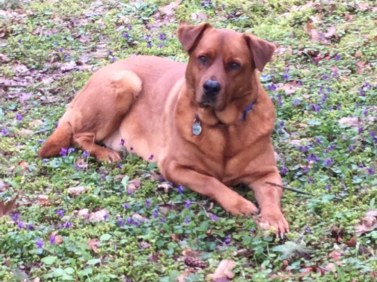Photo of Pam outside her home studio taken by John Phillips, her spouse. They live on a 30 acre White Oak Preserve outside Newberg, Oregon in the Willamette Valley. View of Ribbon Ridge in background. Below is photo of studio assistant and full-time model, Burt.